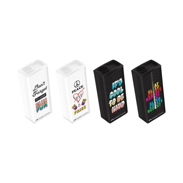 A qualidade dos apontadores Faber-Castell em 4 estampas. O apontador com depósito garante maior praticidade, além de possuir lâmina de aço temperado que traz mais facilidade ao apontar.