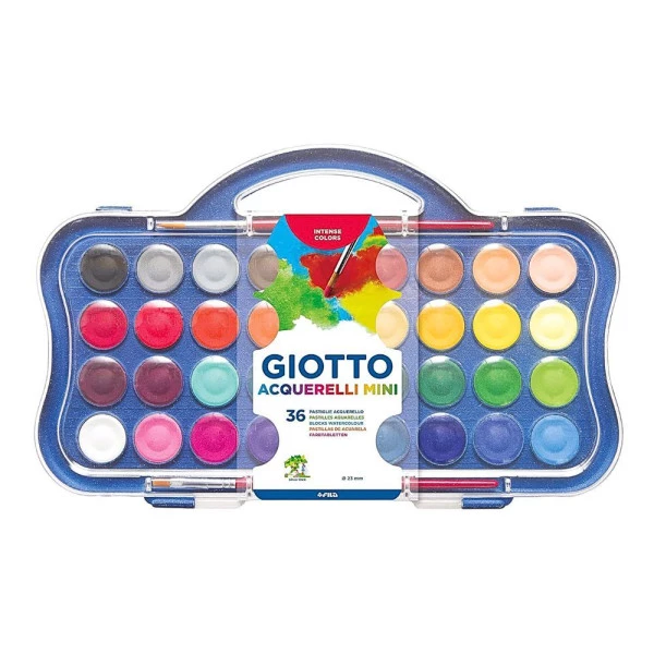 Estojo Aquarela Giotto 36 Cores Mini. Pastilhas aquarela com uma paleta de 36 cores de 23mm com cores ricas, vivas e alta cobertura. Acompanha 1 pincel fibra sintética ponta redonda nº2 e 1 pincel fibra sintética ponta redonda nº3. Características