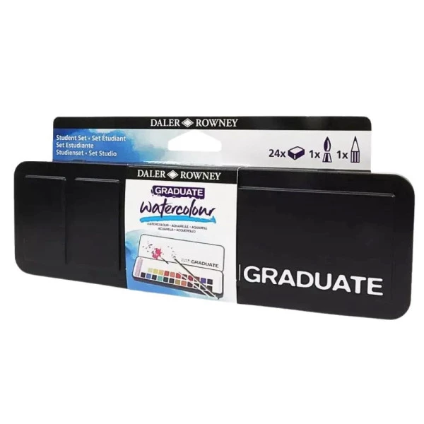 Estojo metálico aquarela 24 cores graduate watercolor da marca Daler Rowney, acompanha 1 lápis HB Lyra e 1 pincel, sua tinta aquarela possui alta pigmentação, com cores intensas, brilhantes, transparentes com excelente desempenho, cria traços delicados. Ideal para estudantes e amadores. Características