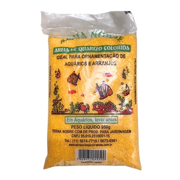 A areia de quartzo colorida da marca Terra Nobre, na cor amarelo gema e com peso de 950g, é uma excelente escolha para quem procura ornamentar aquários ou arranjos decorativos. Essa areia pode ser usada em terrários ou em projetos de decoração, como vasos de plantas, proporcionando um toque colorido. Não altera o pH da água nem interfere no equilíbrio. Características