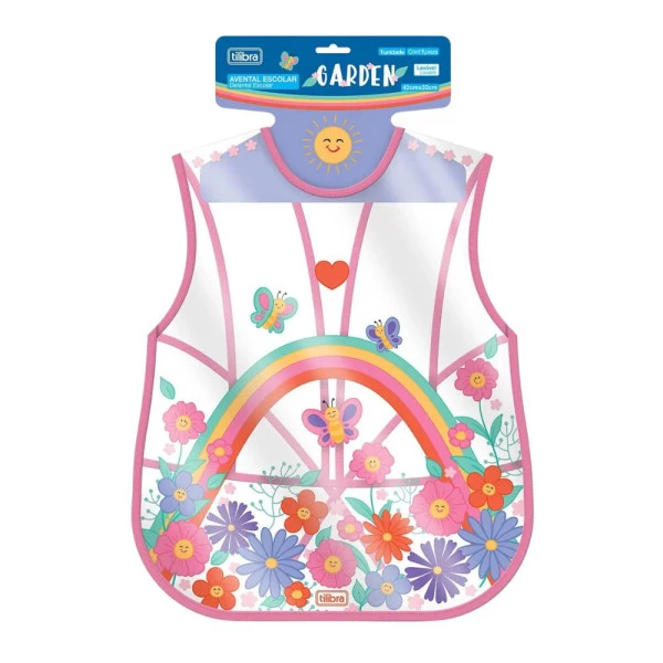 O avental escolar Garden é um acessório para as crianças se divertirem sem o risco de se sujar. O produto, indicado para manter as roupas limpas durante tarefas manuais com tinta e massinha, conta com bolso interno e amarração dupla nas costas.