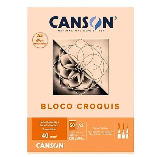 Bloco Canson Croquis Manteiga A2 40g 50 Folhas Translúcido – Papel de textura suave levemente granulada, ideal para esboços, estudos e desenhos técnicos. Oferece boa aderência e vivacidade aos traços, indicado para grafite, lápis de cor e canetas à base de água. Características