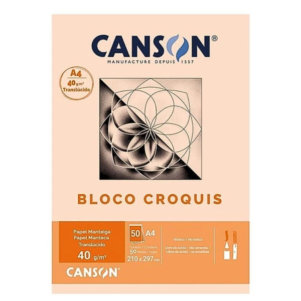 Bloco Canson Croquis Manteiga A4 40g 50 Folhas Translúcido – Papel de textura suave levemente granulada, ideal para esboços, estudos e desenhos técnicos. Oferece boa aderência e vivacidade aos traços, indicado para grafite, lápis de cor e canetas à base de água. Características