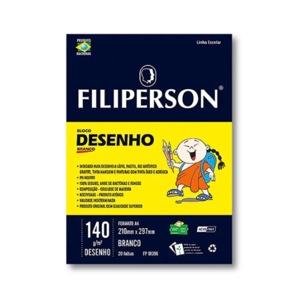 Bloco Escolar de desenho A4 branco 140g/m² com 20 folhas da filiperson. Bloco com papel alcalino, ph neutro, livre de fungos e bactérias. Indicado para atividades escolares e artistica a lápis, pastel, giz artístico, grafite, tinta nanquim, pinturas com tinta a óleo e acrílica. Características