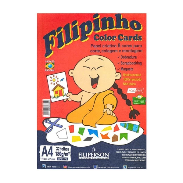 Papel Criativo Filipinho color cards 8 cores A4 210x297mm 180g/m² 32 folhas da Filiperson. É um papel criativo colorido em 8 cores (vermelha/ azul/ amarela/ verde/ laranja/ preta/ branca/ marrom) para corte, colagem, dobradura e montagem. Muito utilizado em atividades escolares, artísticas, dobraduras, técnicas de origami, scrapbooking e maquete. Características