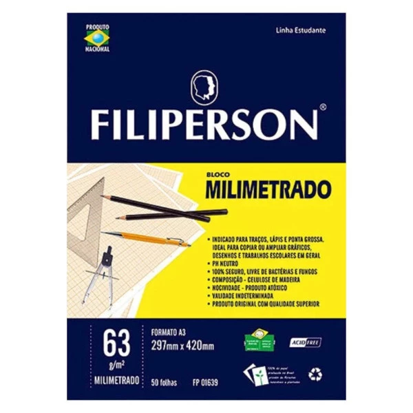 Blocos de papel milimetrado branco para uso técnico, pacote com 50 folhas de papel alcalino, livre de ácidos, impresso, indicado para desenho técnico, artístico, arquitetura e engenharia, no formato e A3 (297 x 420mm) e com gramatura de 63g/m². Características