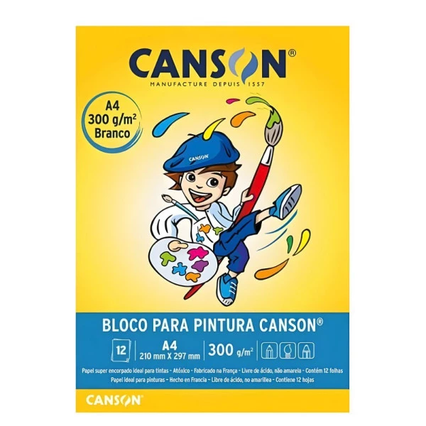 Bloco Canson Pintura A4 300g 12 Folhas Branco – Desenvolvido para crianças em fase inicial da Educação Artística, possui alta gramatura que garante resistência e excelente desempenho em diversas técnicas. Com dupla face (um lado liso e outro canelado), é especialmente indicado para pinturas com guache, aquarela, acrílica e plástica, além de ser ideal também para giz de cera, lápis de cor, recorte e colagem. Características