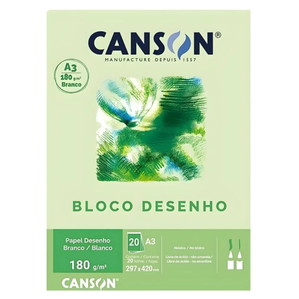 Bloco Canson Desenho A3 180g 20 Folhas Branco - Papel de textura levemente granulada, ideal para técnicas secas como lápis de cor, pastel, carvão, sépia e grafite. De pH neutro, garante ótima aderência, efeitos suaves e maior durabilidade, sendo perfeito para uso escolar e técnico. Características