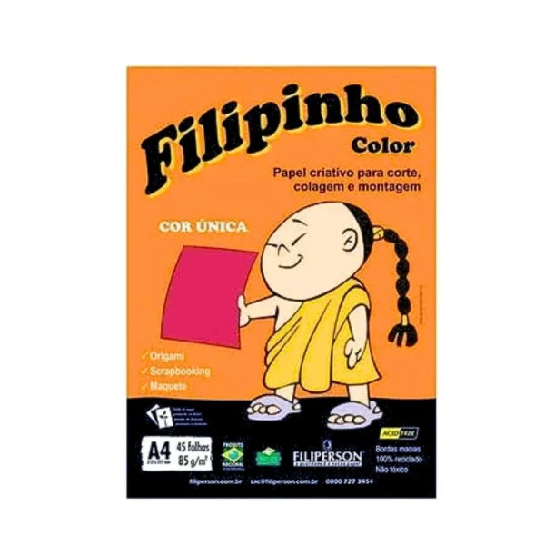 Papel Criativo Filipinho color cor única rosa A4 210x297mm 85g/m² 45 folhas da Filiperson. É um papel criativo colorido em cor vibrante amarelo para corte, colagem, dobradura e montagem. Muito utilizado em atividades escolares, artísticas, técnicas de origami, scrapbooking e maquete. Características