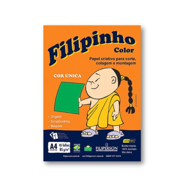 Papel Criativo Filipinho color cor única verde A4 210x297mm 85g/m² 45 folhas da Filiperson. É um papel criativo colorido em cor vibrante amarelo para corte, colagem, dobradura e montagem. Muito utilizado em atividades escolares, artísticas, técnicas de origami, scrapbooking e maquete. Características