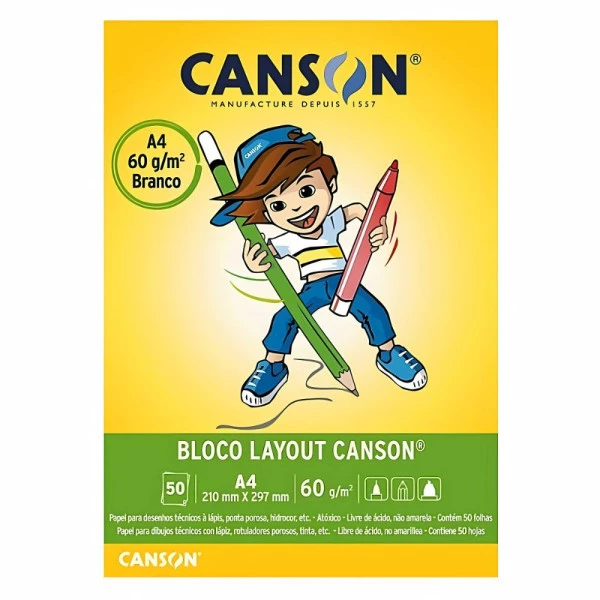 Bloco Layout Canson A4 60g 50 Folhas Branco – Papel de textura lisa e superfície uniforme, ideal para rascunhos, esboços, desenhos escolares, gráficos e estudos técnicos ou artísticos. Leve e versátil, é indicado para lápis de cor, grafite, canetas porosas e marcadores à base de água. Características