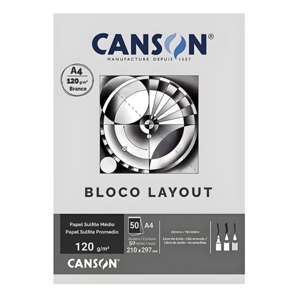 Bloco Layout Canson A4 120g 50 Folhas Branco Sulfite médio – Papel liso de alta gramatura, ideal para gráficos, desenhos geométricos e projetos técnicos ou escolares. Indicado para lápis de cor, grafite, caneta esferográfica e marcadores à base de água, garantindo resistência e excelente acabamento. Características