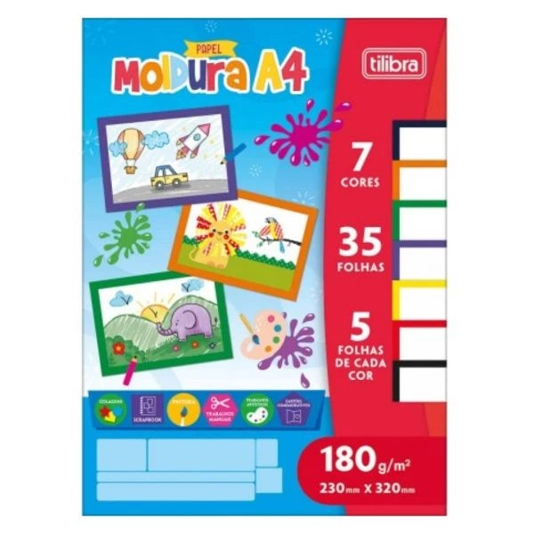 O Bloco Moldura A4 Tilibra foi desenvolvido para dar destaque e acabamento especial a atividades escolares, artesanais e projetos decorativos. Com 35 folhas, sendo 7 cores e 5 folhas de cada cor, o bloco oferece variedade e versatilidade para composições criativas.