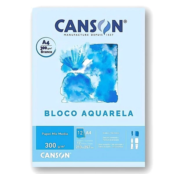 Bloco Canson Aquarela A4 com 12 folhas de 300g/m², papel artístico branco natural de alta gramatura e dupla face (texturizada e lisa). Versátil e resistente, é ideal para aquarela, guache, tinta acrílica e técnicas secas como pastel, giz oleoso e lápis de cor, oferecendo excelente custo-benefício e ótima conservação. Características