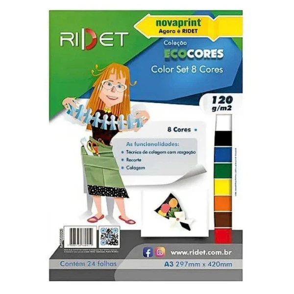 Bloco de Papel Criativo com 8 Cores Color Set 120g/m² possui 24 Folhas, Formato A3 297X42mm da Ridet. Características
