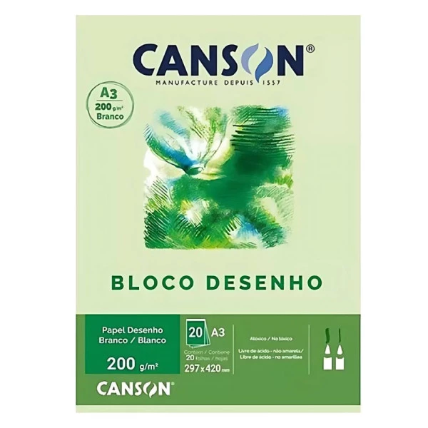 Bloco Canson Desenho A3 200g 20 Folhas Branco - Papel de textura levemente granulada, ideal para técnicas secas como lápis de cor, pastel, carvão, sépia e grafite. De pH neutro, garante ótima aderência, efeitos suaves e maior durabilidade, sendo perfeito para uso escolar e técnico. Características