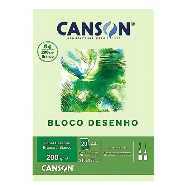 Bloco Canson Desenho A4 200g 20 Folhas Branco - Papel de textura levemente granulada, ideal para técnicas secas como lápis de cor, pastel, carvão, sépia e grafite. De pH neutro, garante ótima aderência, efeitos suaves e maior durabilidade, sendo perfeito para uso escolar e técnico. Características