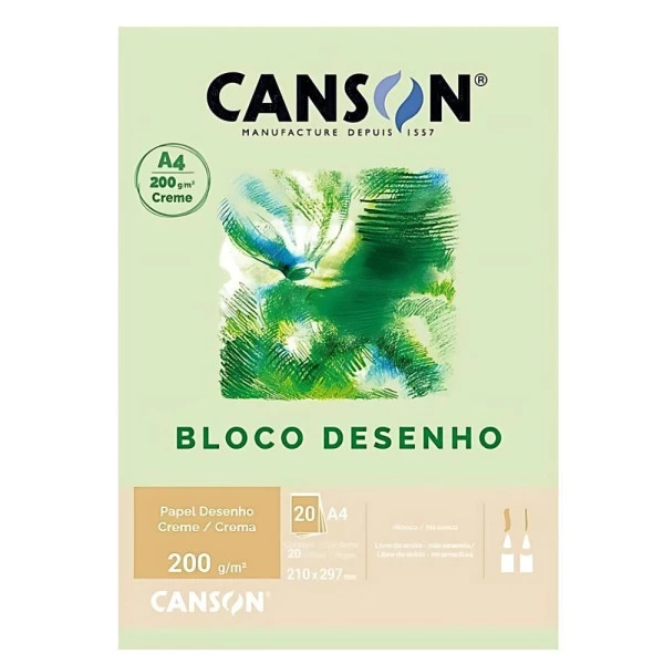 Bloco Canson Desenho A4 200g 20 Folhas Creme - Papel de textura levemente granulada, ideal para técnicas secas como lápis de cor, pastel, carvão, sépia e grafite. De pH neutro, garante ótima aderência, efeitos suaves e maior durabilidade, sendo perfeito para uso escolar e técnico. Características