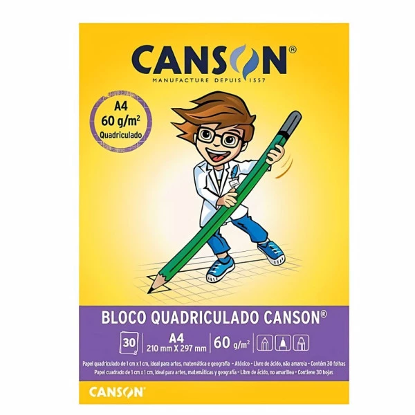 Bloco Quadriculado Canson A4 60g com 30 folhas, possui quadrados de 1x1 cm, ideal para atividades escolares e profissionais em matemática, geografia e educação artística. Prático e versátil, auxilia na criação de gráficos, tabelas, mapas e no desenvolvimento de habilidades como coordenação motora, noção espacial e raciocínio lógico. Características