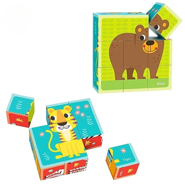 Acompanha 9 blocos de madeira, coloridos e de alta qualidade, que podem ser combinados para formar diferentes imagens. Cartões ilustrados com os desenhos dos animais correspondentes aos quebra-cabeças.