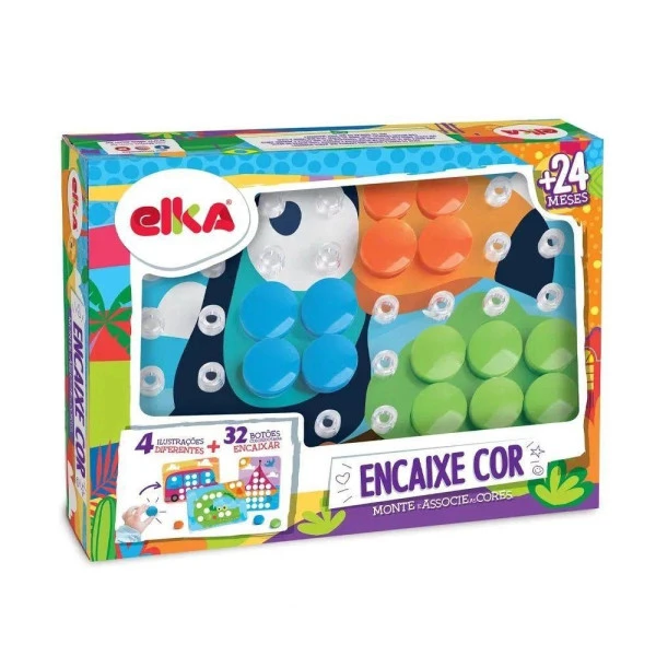Brinquedo Encaixe Cor Monte e Associe da Elka. Vamos brincar de encaixar e associar as cores. Coloque uma cartela no painel. Preencha os círculos brancos sobrepondo os botões coloridos, com a cor correspondente. Características