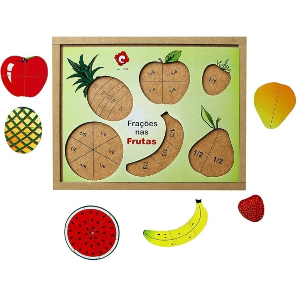 Descritivo detalhado: Confeccionado em M.D.F. 21 peças mais 1 base. Peças pintadas e serigrafadas com tinta atóxica, com ilustrações de frutas, representado as frações (Morango = 1 inteiro; Pera = 1/2; Banana = 1/3; Maçã = 1/4; Abacaxi = 1/5 e Melancia = 1/6). Medida: 33,5 x 26,5 cm. Embalagem: Película de P.V.C. encolhível. Características