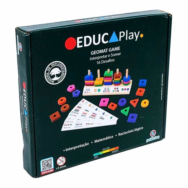 O Jogo Geomat Game Educa Play é um brinquedo educativo com 16 desafios, onde as crianças interpretam imagens nas cartelas e as reproduzem com formas geométricas na base. Feito de madeira resistente, estimula habilidades matemáticas e de raciocínio, tornando o aprendizado divertido e envolvente.