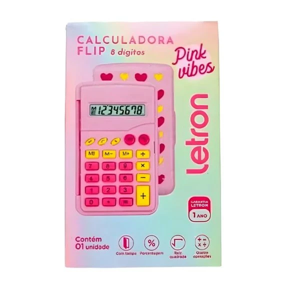 Calculadora de bolso com 8 dígitos, prática e funcional, ideal para o dia a dia escolar, profissional ou doméstico. O modelo Flip Pink Vibes traz um design moderno e compacto, com tampa protetora que facilita o transporte e mantém o visor sempre seguro. Leve e fácil de usar, é perfeita para quem busca praticidade com um toque de estilo.