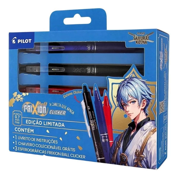Caneta Esferográfica Apagável Frixion Ball 0.7 Pilot, Edição especial Samurai Kizuna acompanha 3 canetas na cor azul, preta e vermelha, e um chaveiro icônica tradição japonesa.