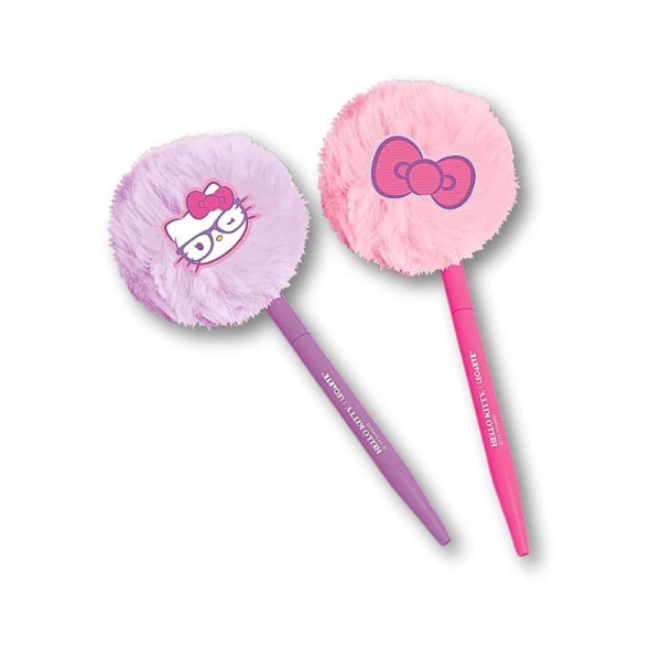 Caneta fofa Pompom com Aplique Hello Kitty corpo e pompo roxo vem com rosto da Hello Kitty e tinta Roxa. Já a caneta de corpo e pompom rosa e aplique laço da Hello Kitty vem com tinta rosa.