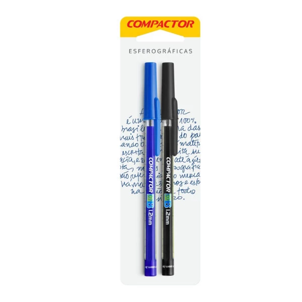 O blister contém 2 unidades, nas cores azul e preto, ambas com design leve e ergonômico que facilita o uso prolongado. Uma opção prática, durável e essencial para diversas necessidades de escrita. Características