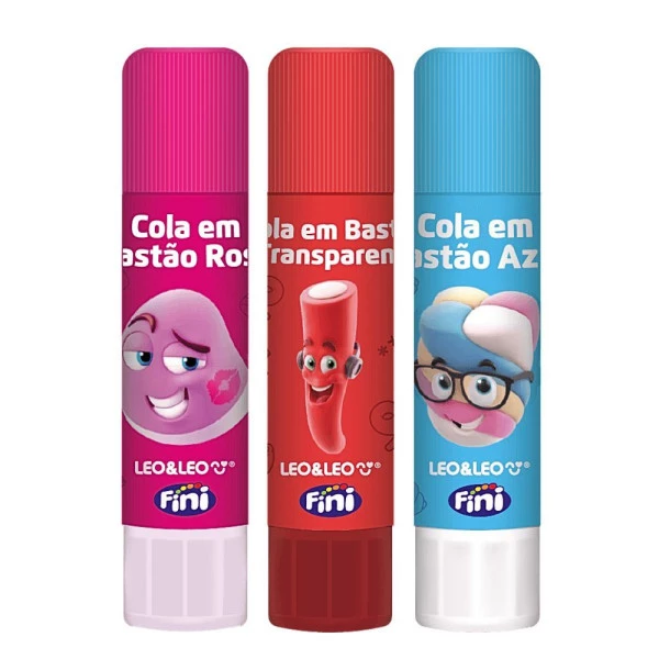 Cola Bastão Colorida 10 Gramas Fini Cores Sortidas Leo&Leo, lavável e atóxica. Possui três modelos colecionáveis. Características