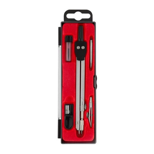 O conjunto vem completo com 5 peças — compasso metálico, tira-linha, ponta seca, lapiseira e mina extra — oferecendo versatilidade para diferentes tipos de traço e aplicação.