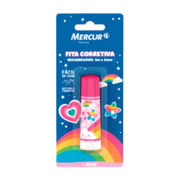 Fita Corretiva Recarregável 6mx5mm Cores Mágicas Mercur, esta fita possui refil, podendo ser facilmente recarregada. Correção à seco permitindo uma escrita instantânea após sua aplicação. Características