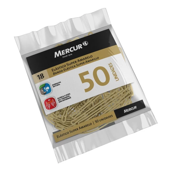 Elastico Super Amarelo 18 50und da Mercur, resistente podendo ser reutilizado. Possui condições de alongar em até 4 vezes o seu tamanho. Características