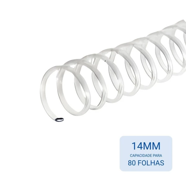 Espiral de plástico de 14mm é um fio flexível de PVC usado para encadernar documentos, ideal para agrupar cerca de 80 folhas (sulfite 75g) em materiais como apostilas, cadernos e relatórios, permitindo que o material abra 360 graus para facilitar o manuseio e oferecendo durabilidade e acabamento profissional. Características