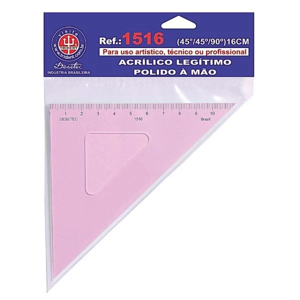 O Esquadro Trident modelo 1516 é feito em acrílico cristal de 2 mm, com ângulos de 45°/45°/90° e 16 cm de comprimento. Produzido por usinagem artesanal, oferece alinhamento preciso, acabamento fino e bordas retas sem chanfro. Com escalas e não injetado, garante alta qualidade e precisão em trabalhos técnicos e artísticos. Características