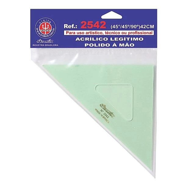 O Esquadro Trident modelo 2542 é feito em acrílico cristal de 2 mm, com ângulos de 45°/45°/90° e 42 cm de comprimento. Produzido por usinagem artesanal, oferece alinhamento preciso, acabamento fino e bordas retas sem chanfro. Sem escalas e não injetado, garante alta qualidade e precisão em trabalhos técnicos e artísticos. Características