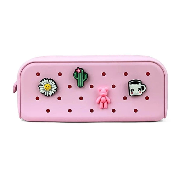 ESTOJO ESCOLAR SILICONE CHARM COM 4 PINGENTES ROSA