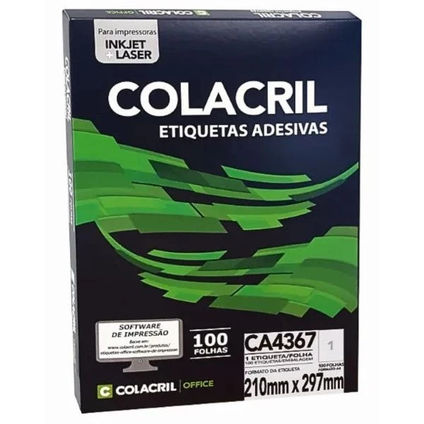 Etiquetas adesivas A4 Inkjet ou laser 1 210 x 297mm 100 folhas branca CA4367 colacril. Perfeitas para criação de rótulos, sinalizações, cartazes, etiquetas de embalagem grandes, e outras aplicações que requerem uma etiqueta de folha inteira. Indicadas para impressoras de jato de tinta e laser. Características