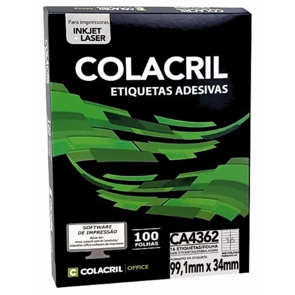 Etiquetas Adesivas A4 Inkjet ou laser 16 99,1 x 34,0mm 100 folhas branca ca4362 colacril. Ideal para etiquetas de endereçamento, identificação de produtos, organização de documentos e arquivos, e etiquetas de inventário. Indicadas para impressoras de jato de tinta e laser. Características
