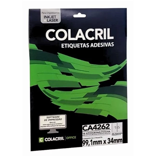 Etiquetas Adesivas A4 Inkjet ou laser 16 99,1 x 34mm 25 folhas branca ca4262 colacril. Ideal para etiquetas de endereçamento, identificação de produtos, organização de documentos e arquivos, e etiquetas de inventário. Indicadas para impressoras de jato de tinta e laser. Características