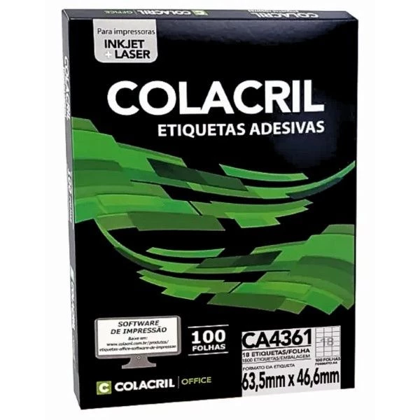 Etiquetas Adesivas A4 Inkjet ou laser 18 63,5 x 46,6mm 100 folhas branca ca4361colacril. Ideal para etiquetas de endereçamento, identificação de produtos, organização de documentos e arquivos, e etiquetas de inventário. Indicadas para impressoras de jato de tinta e laser. Características
