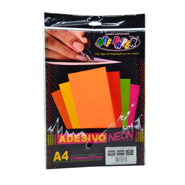Etiqueta Adesiva Off Paper. Essa etiqueta é feita de papel adesivo de alta qualidade, com uma cor laranja neon vibrante que chama a atenção de qualquer um. Ela é ideal para impressão a laser ou jato de tinta, e vem em folhas A4 que podem ser cortadas no tamanho que você quiser. Com a Etiqueta você pode personalizar seus materiais de forma criativa e profissional. Características