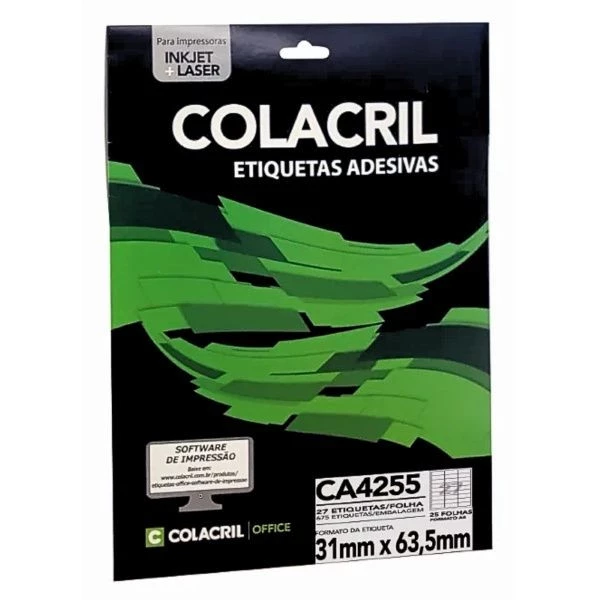 Etiqueta adesiva A4 Inkjet ou laser 27 31 x 63,5mm 25 folhas branca ca4255 colacril. Ideal para etiquetas de endereçamento, identificação de produtos, organização de documentos e arquivos, e etiquetas de inventário. Indicadas para impressoras de jato de tinta e laser. Características