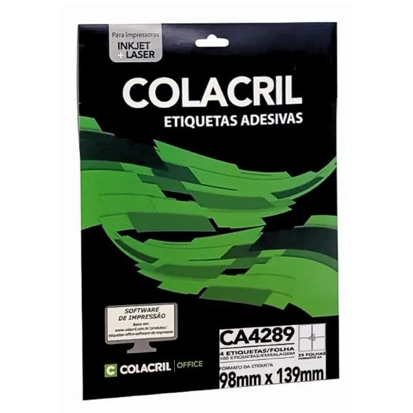 Etiqueta adesiva A4 Inkjet ou laser 4 98 x 139mm 25 folhas branca CA4289 colacril. Ideal para criação de etiquetas grandes para envio, rótulos, ou etiquetas de embalagem, indicadas para impressoras de jato de tinta e laser Características