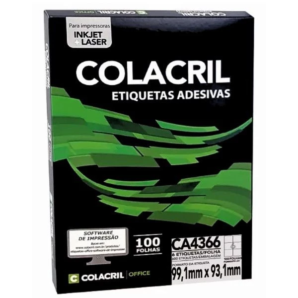 Etiqueta adesiva A4 Inkjet ou laser 6 99,1x 93,1 100 folhas branca CA4366 colacril. Ideal para criação de etiquetas grandes para envio, rótulos, ou etiquetas de embalagem, indicadas para impressoras de jato de tinta e laser. Características