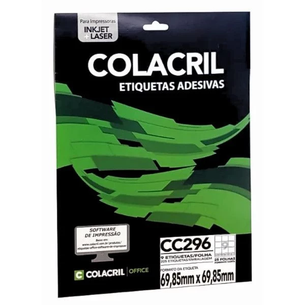 Etiqueta adesiva carta Inkjet ou laser 9 69,85 x 69,85mm 25 folhas branca CC296 colacril. Ideal para etiquetas de endereçamento, identificação de produtos, organização de documentos e arquivos, e etiquetas de inventário. Indicadas para impressoras de jato de tinta e laser. Características