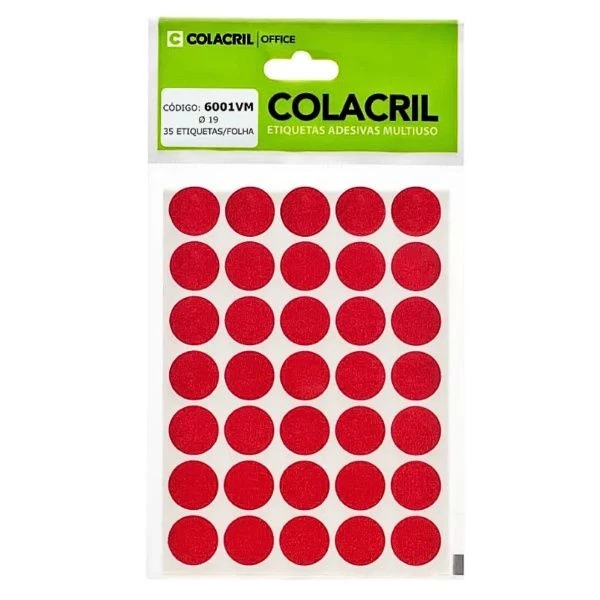 Etiqueta Adesiva Multiuso Redonda 19mm Vermelha 210 unid (Colacril 6001VM). Etiquetas adesivas ideais para identificação, organização, codificação e sinalização. Podem ser usadas em produtos, documentos, catálogos e para fechamento de envelopes. Características