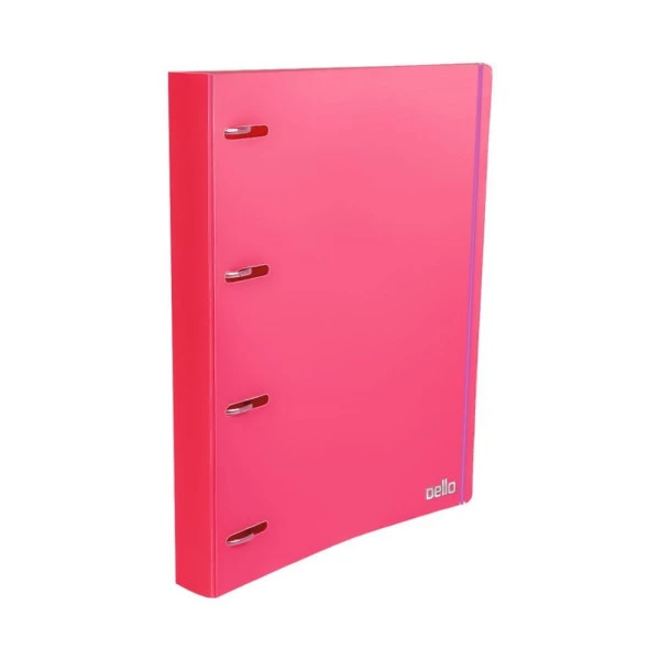 Fichário Pasta PP 4 Argolas Full Color Rosa Fluor da Dello. Formato padrão A4, material em polipropileno, e quatro argolas metálicas. Perfeito para organizar trabalhos escolares, documentos profissionais ou projetos pessoais.